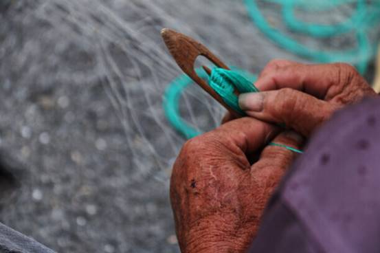 大家一起围坐在正在补网的渔民们周围,认真观察学习渔网的手工编制技巧。渔民伯伯也很热情,看到我们围过来就放慢了手中的动作,网梭和线穿来引去,动作行云流水,渔网在手中被渐渐补全,我认真观摩着,心中升起一种感动,不过数十年前,我们的渔民还凭借着这一门纯手工的技艺与大海搏斗,与自然共生,创造着激情澎湃的海洋文化,书写着人与自然的伟大史诗。