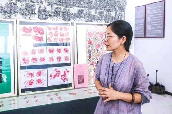 图为王倩倩老师为“向海问津”实践队员们介绍剪纸作品。