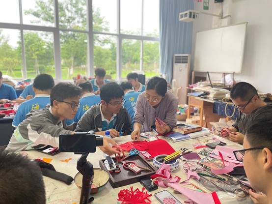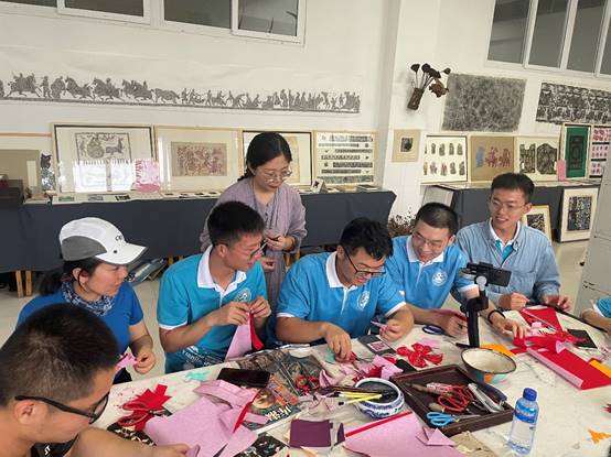 图为实践队员们体验剪纸技艺,互相交流想法,王倩倩老师在旁观察指导。