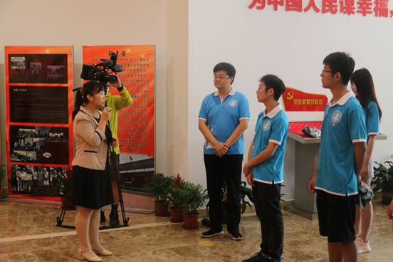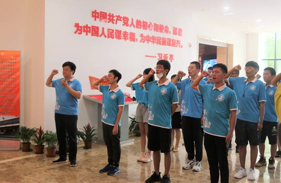 图为展馆参观结束后,实践队全体党员同志佩戴党徽,在蜜桃av 党委副书记靳楠同志的带领下,面向党旗,高举右拳,重温入党誓词,神情庄重,声音铿锵。