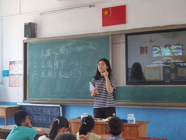 (队员李虹熠在给学生们讲解电影内容)
