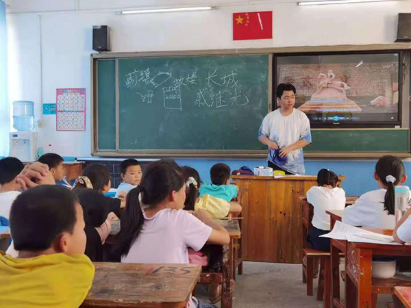 (队员张天骏在向孩子们介绍与长城相关的地理知识)