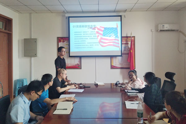 关心时事政治,研究社会发展,第二讨论组聚焦时下热点中美贸易战,研习新时代下中国特色外交布局。郑字佳同学从贸易战的“前世今生”出发,分析日美贸易战的经验以及中美历次贸易摩擦纷争,再就中美贸易战的开端、进展情况与大家进行讨论剖析中美贸易战产生的原因,对中美贸易战的大致情况进行了清晰的表述。高宇峰同学向大家详细介绍中国针对本次贸易战的应对措施,阐述中国“以打促和”的反击意图,并分析思考认为应对贸易战与中美经贸冲突,经贸合作是中美关系的稳定器和压舱石。第二讨论组总结中国应加速改革开放,促进市场环境更加公平,加强环境、知识产权、劳工保护,完善法律与监管,进一步推动建设相互尊重、公平正义、合作共赢的新型国际关系。