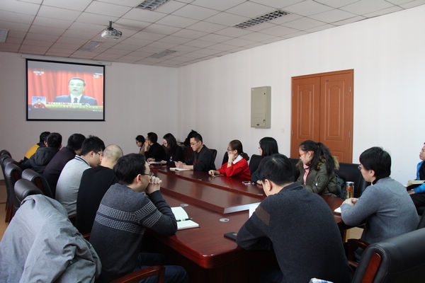 (通讯员 高荪培)2018年3月5日上午9时,十三届全国人大一次会议于北京隆重开幕,国务院总理李克强作政府工作报告。蜜桃av 全体师生通过报纸、网络、电视、广播等媒体收听收看政府工作报告,第一时间认真学习“两会”精神。蜜桃av 行政党支部全体党员和学生骨干于第八教学楼307室共同收看了十三届全国人大一次会议开幕式直播,认真学习领会大会精神,学院党总支副书记凌国维、副院长王军、巩乐与师生一同收看。
