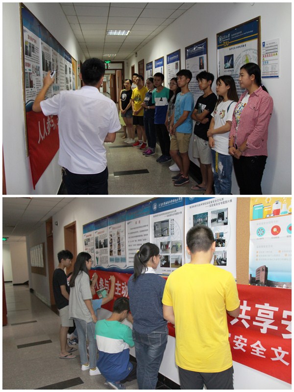 9月22日,学院选取安全建设规范实验室图片以及安全防护知识海报在学院一层大厅进行展示,学院部分本科生及研究生进行参观,参观过程中由蜜桃av 实验技术系列教师吕志伟老师结合蜜桃av 实际情况对规范要求进行讲解,向同学们强调操作规程,讲授佩戴防护设备注意事项,希望学生在实验过程中能做到看懂危险标识,了解潜在危险,懂得规避危险,做好安全防护。活动张贴了本次安全文化周活动主题条幅,充分调动了师生的主观能动性,学院师生积极在条幅上签写防护实验室安全标语,共同肩负起防护实验室安全的责任。