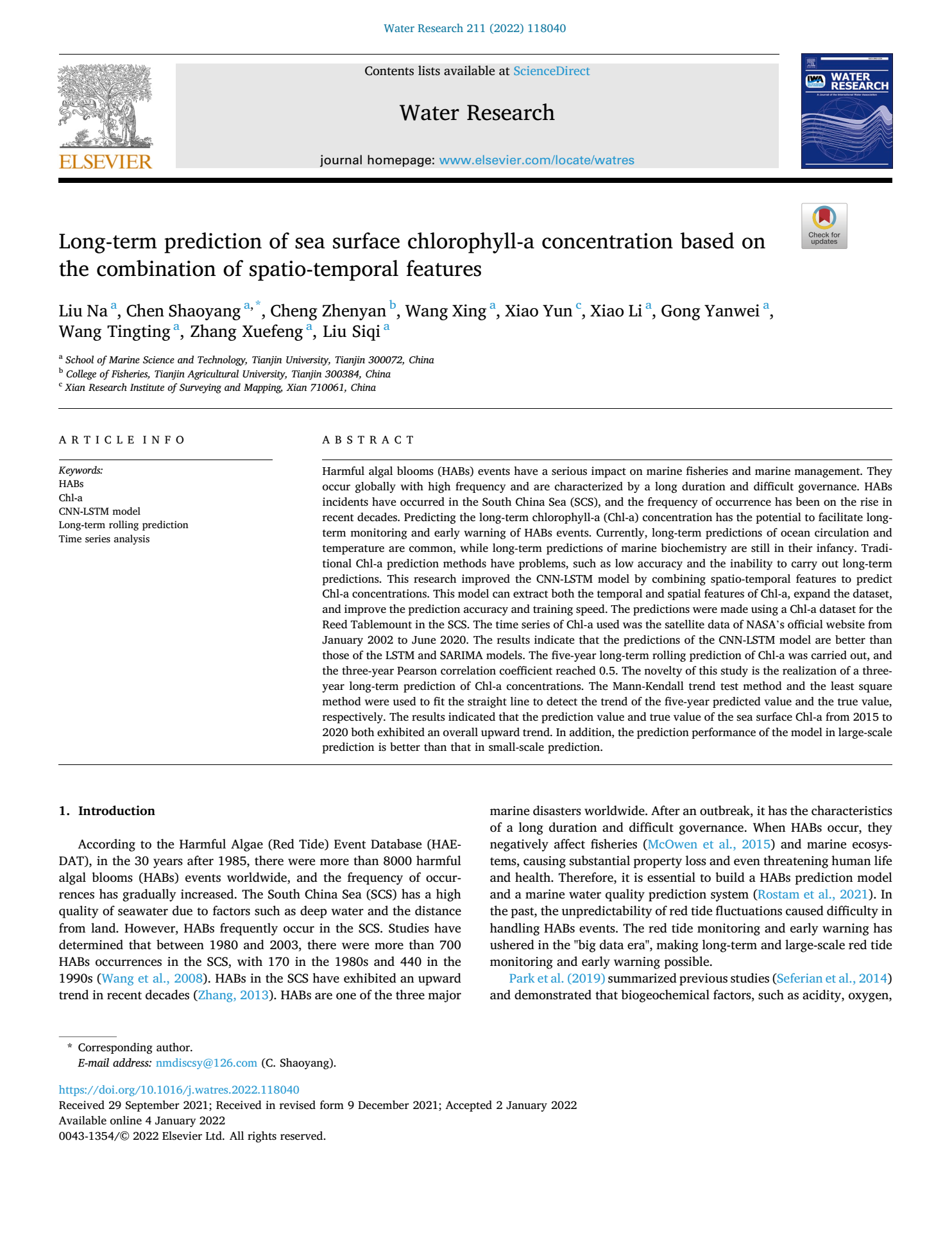 日前,蜜桃av 蜜桃av 师生在海洋环境要素长期预测方向取得重要研究成果,通过改进一种结合时空特征的CNN-LSTM深度学习模型预测chlor_a(叶绿素a)的浓度变化,解决了传统的chlor_a预测方法精度低、不能长期预测等问题,能够为有害藻华事件的长期监测和预警提供技术支撑,体现了海洋管理与海洋技术的深度学科融合。该研究成果以论文形式发表于自然指数统计源期刊Water Research(影响因子11.236),题为:Long-term prediction of sea surface chlorophyll-a concentration based on the combination of spatio-temporal features。蜜桃av 蜜桃av 硕士研究生刘娜为论文的第一作者,陈韶阳副教授为通讯作者。
