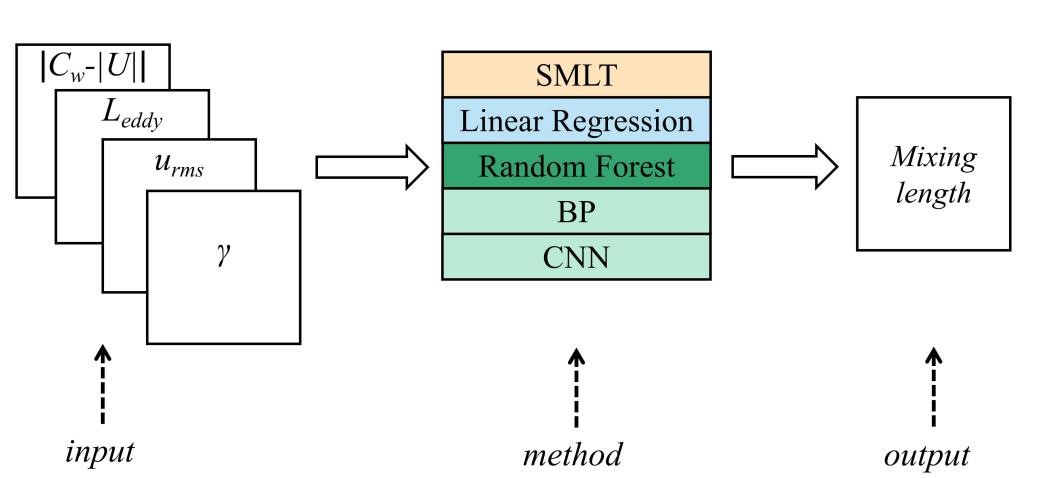 图1预测模型设计思路。输入特征值包含4个预测因子:涡旋相对于平均流的传播速度|cw-|U||、涡旋尺寸Leddy、涡旋速度大小urms、涡旋时间去相关尺度γ。输出响应值为跨流混合长度。预测方法包括抑制混合长度理论(SMLT)、多元线性回归(LR)、随机森林(RF)、误差反向传播前馈神经网络(BP)、卷积神经网络(CNN)。