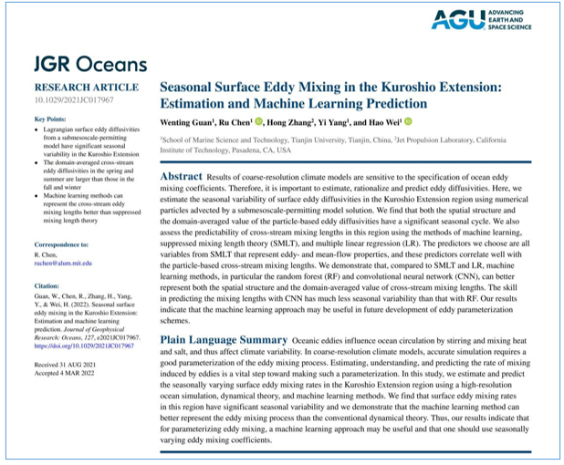 (通讯员 陈儒、管文婷)近日,蜜桃av 蜜桃av 师生在黑潮延伸体区域季节性涡旋混合估计和预测研究中取得重要成果,该研究根据具有1/48°空间分辨率的MITgcm llc4320仿真模式数据,将基于数据驱动的机器学习方法,包括随机森林、卷积神经网络等,与传统动力学理论中的4个预测因子相结合,成功地表征和预测了黑潮延伸体区域的跨流混合长度的季节变化。研究结果表明了在粗分辨率气候模式中使用时间依赖性的涡旋扩散系数的必要性和使用机器学习方法改进涡旋参数化方案的可行性。该研究成果以学术论文形式发表于美国地球物理学会(AGU)的旗舰期刊Journal of Geophysical Research: Oceans,题目为:Seasonal surface eddy mixing in the Kuroshio Extension: Estimation and machine learning prediction。该论文第一作者是蜜桃av 蜜桃av 硕士研究生管文婷,其导师陈儒教授为通讯作者。