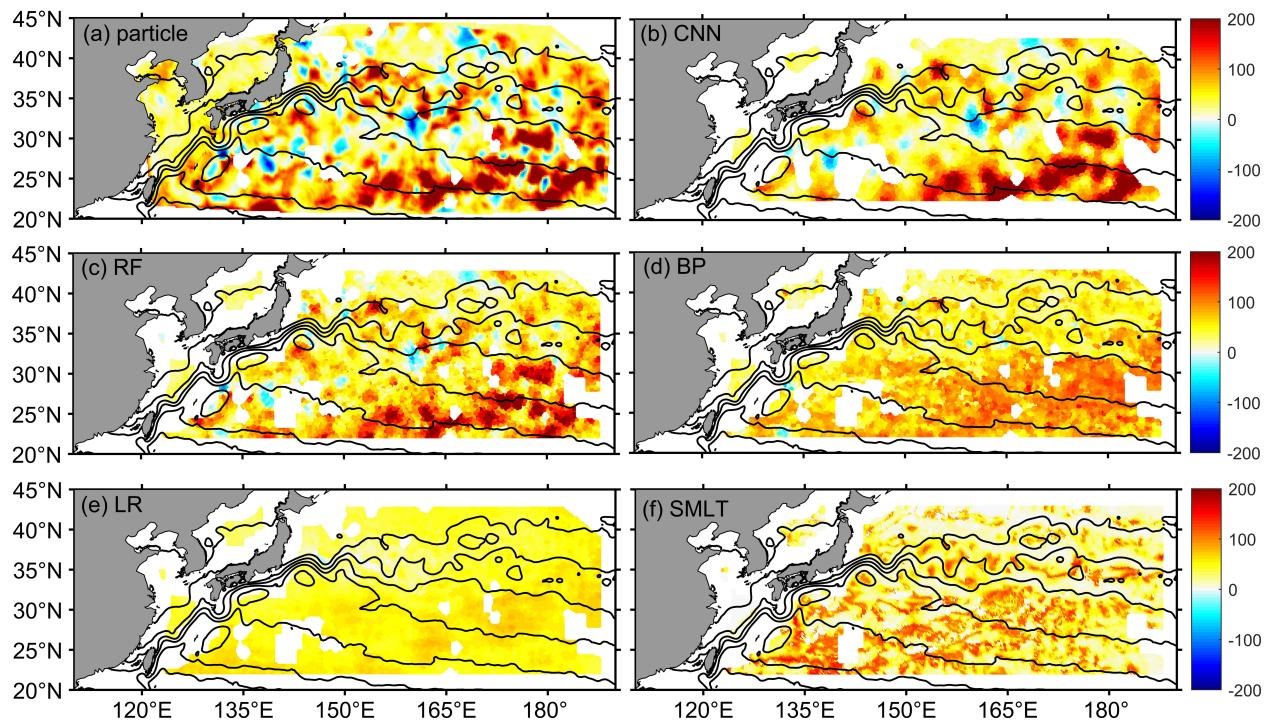 海洋涡旋通过搅拌和混合关键示踪剂(如热、盐等)影响水团性质和区域性气候变化。现有粗分辨率气候模式中常以涡旋扩散系数表征涡旋混合速率,研究涡旋混合时空变化有助于提高涡旋参数化方案和气候模拟预测的准确性。传统动力学的抑制混合理论长度理论(SMLT)为机器学习预测模型提供了有效的四个预测因子:涡旋尺寸、涡旋速度大小、涡旋时间去相关尺度和涡旋相对于平均流的传播速度大小。利用随机森林、卷积神经网络等机器学习方法的强非线性拟合能力,构建预测因子与混合长度之间的非线性关系,从而精确预测季节性混合长度变化。