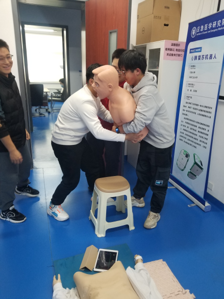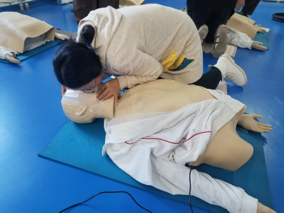 师生在培训导师的专业指导下逐一进行了人工呼吸、心肺复苏、自动体外除颤、海姆立克急救的正确操作步骤,完成应急救护实操训练的模拟演练。