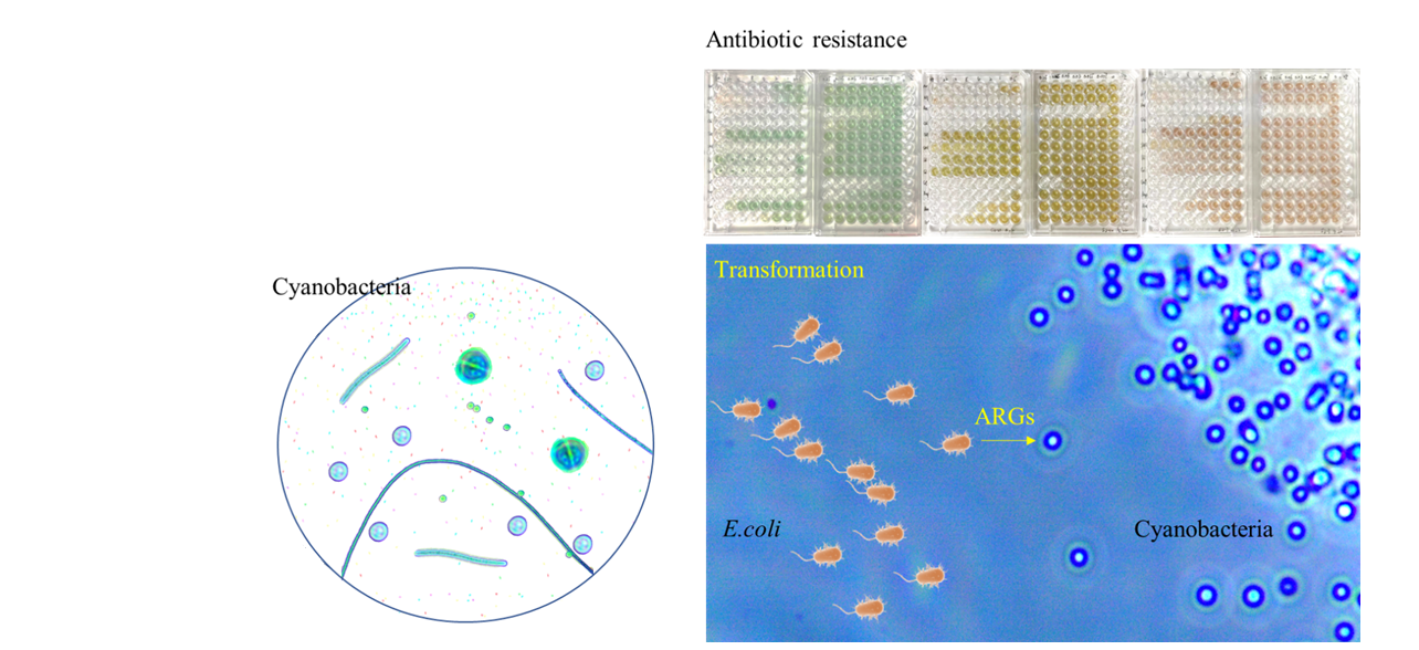目前,海洋环境,尤其是近岸海域中具有较为严重的耐药基因污染,了解ARGs的传播途径对于控制耐药风险具有十分重要的意义。之前的研究多关注于人类活动造成的海洋耐药基因污染,而对海洋中广泛存在的原位微生物对耐药基因的作用关注较少。本研究选取海洋中广泛存在的蓝细菌为研究对象,通过实地监测探究了蓝细菌与耐药基因的关系,并借助实验室实验探究了海洋蓝细菌的抗生素耐药特征,包括海洋蓝细菌抗生素耐药性、对耐药基因的携带情况,以及通过水平转移接纳耐药基因的能力。研究表明海洋蓝细菌可以在海水条件下对多种抗生素具有较强的抗性,本身可以携带多种耐药基因和促进耐药基因传播的I类整合子基因,并且筛选的一株海洋蓝细菌可以通过转化接纳外源的耐药基因,表达较高的抗生素抗性(图2)。本研究扩展了对产生抑菌物质的光合自养细菌对于环境中ARGs作用的认识,进一步明确和丰富海洋微生物对于海洋ARGs传播的影响和机理,得到了国家自然科学基金的支持。2018级博士辛蕊为本研究成果第一作者,牛志广教授、马永正讲师为指导老师。