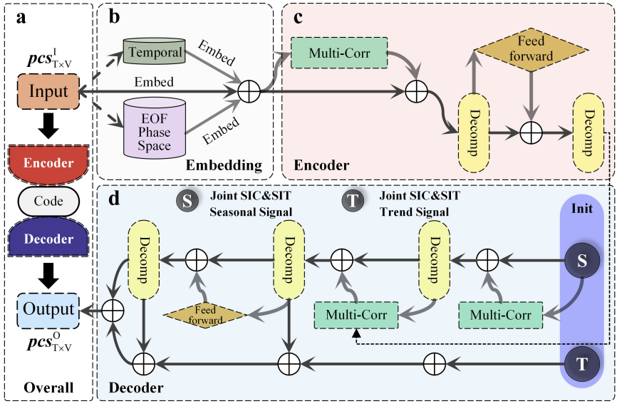 该研究建立了纯遥感数据驱动的北极海冰多要素智能化预报框架(IceFormer),实现了泛北极连续45天逐日的海冰密集度(SIC)与海冰厚度(SIT)预报。其不仅考虑了北极海冰时空变量间的耦合依赖性,还增强了北极海冰次季节预报的可解释性。更重要的是,IceFormer以秒级实现时空多尺度的网格化预报,比现有数值模式更加轻量级。