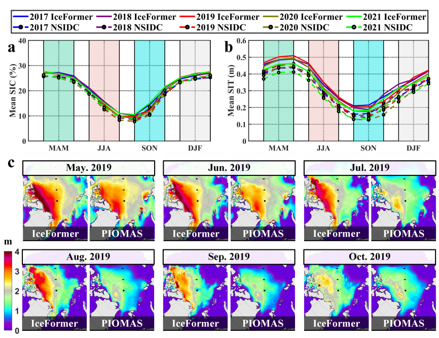 通过与欧洲中期天气预报中心(ECMWF)的全球冰海耦合季节尺度预报系统(SEAS5)比较。IceFormer在融冰季节的预报性能明显优于SEAS5。同时,IceFormer的单次预报性能优于SEAS5的51组集成平均。结果表明,IceFormer对不同时空尺度上的海冰演化具有较强的预报能力,对提升北极海冰集合预报具有一定参考价值。