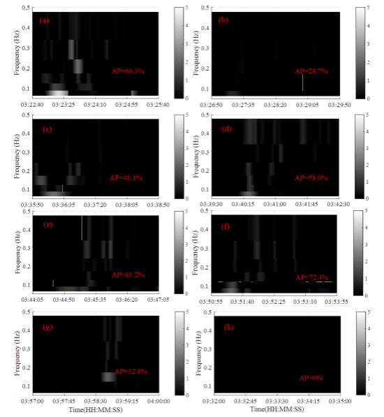 图4不同时间段内的船舶探测结果,其中子图(a)~(g)均有船舶经过,而子图(h)时间段内无船经过
