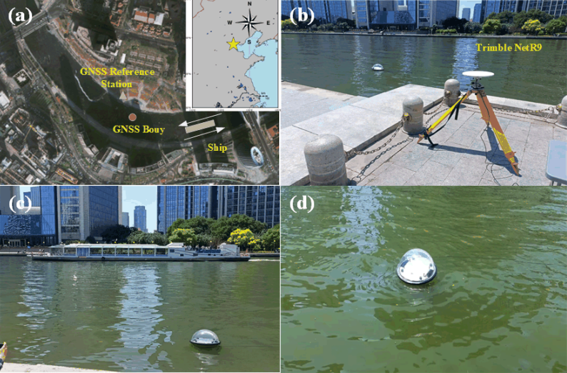 图3天津海河船舶探测实验,其中(a)图为实验地点,(b)图给出了GNSS基准站和MGB-2浮标的布放位置,(c)图为过往的船只,(d)图展示了在船舶尾流的影响下,浮标发生晃动