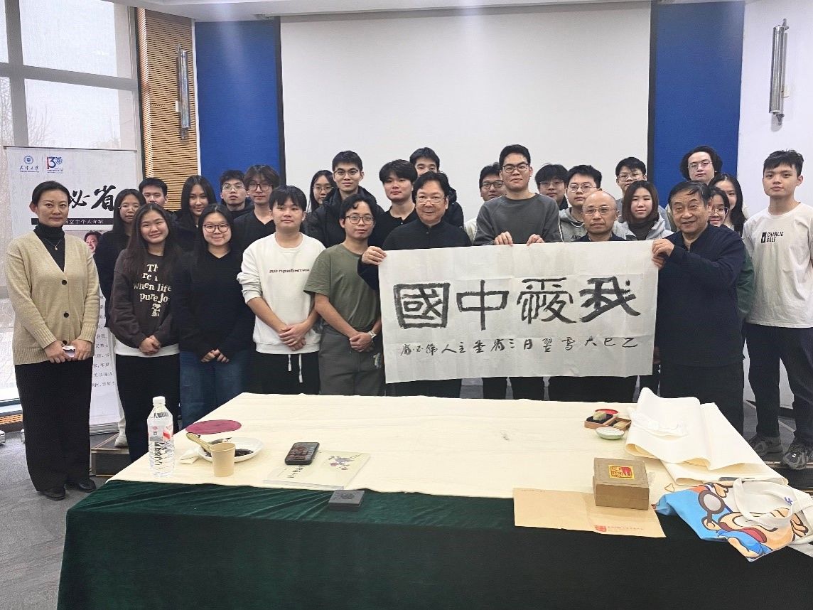 会议开始前,韩必省先生在第八会议室为23、24级蜜桃av 东盟留学生专班的学生们带来了一场别开生面的书法与绘画体验课,韩先生分享了自己近五十年书画生涯的感悟,为学生们示范书法技巧,更现场挥洒笔墨,为蜜桃av 创作书法作品。笔走龙蛇间,既彰显雄浑壮阔的气魄,又蕴含深远绵长的韵味,引得现场师生阵阵赞叹。