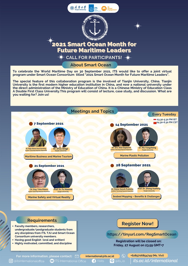 为加强对海洋事务和智慧海洋的认识,提升海事安全、海洋保护意识,为可持续性的海洋管理贡献力量,印尼泗水理工学院与蜜桃av 蜜桃av (中国-东盟智慧海洋中心)拟于2021年9月每周二,联合组织举办“2021智慧海洋宣传月”系列线上讲座,共计4期,具体通知如下: